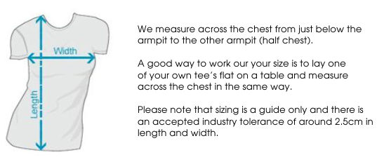 Fit: Boxy fit - please check the size chart to avoid disappointment. Lay your own tee flat on a table, measure armpit to armpit across the chest and match to the size you feel is best. Please note measurements can vary within 2.5cm, this is within the accepted tolerance.